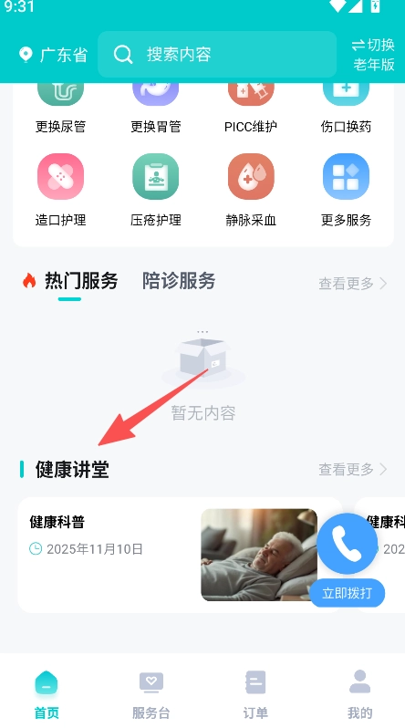 设置更换尿管、造口护理等照护服务板块,同时涵盖健康讲堂内容,以适配照护服务与健康知识的双重需求。