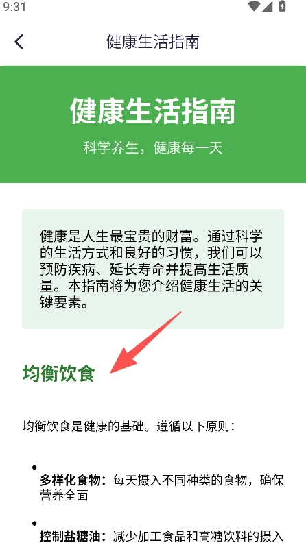可以查看健康生活指南的详细内容,浏览均衡饮食等方面的要点,从而了解健康生活的具体知识。