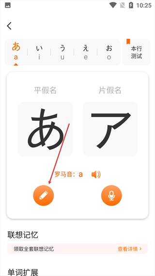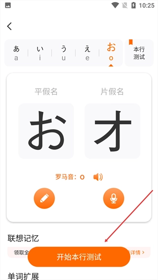 在学完あ行的全部假名后,点击【开始本行测试】按钮,就能检验对这一段内容的学习掌握程度了。