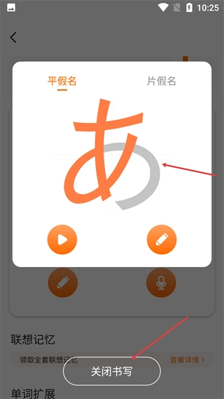 完成假名书写练习后,点击【关闭书写】按钮,返回学习界面。
