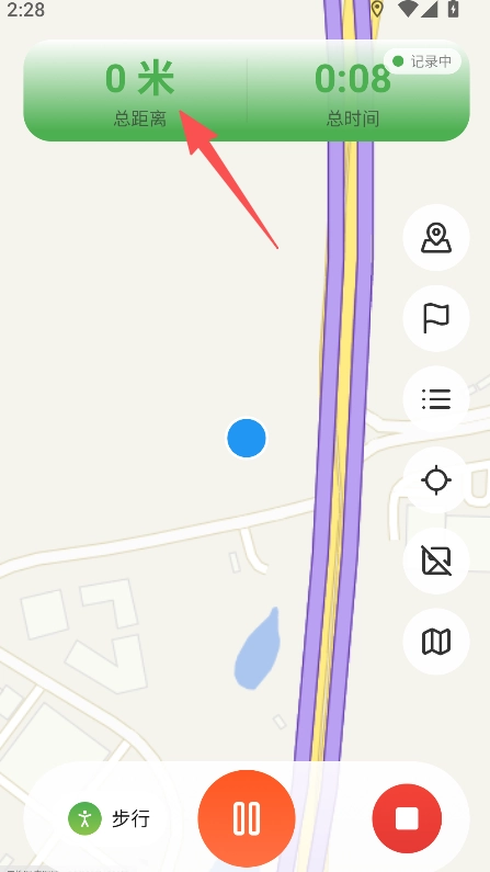 点击开始按钮,开启轨迹记录查看总距离与时间。