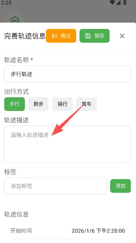 设置轨迹信息完善功能,用于填写名称、描述和标签,对轨迹的详细信息进行整理与保存。