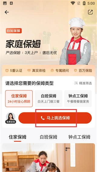 进入【家庭保姆】页面后,能选择【住家保姆】、【白班保姆】等不同类型,点击【马上挑保姆】按钮,就可以着手筛选适合的保姆了。