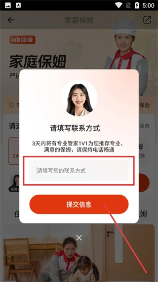 点击【马上挑保姆】按钮后,页面将弹出填写联系方式的窗口,填写完相关信息并点击【提交信息】,专业管家会在3天内为您提供1V1的保姆推荐服务。
