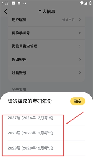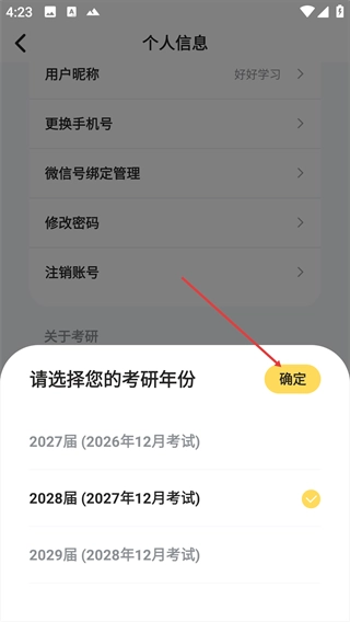 选定考研年份后,点击弹窗右上角的【确定】按钮,就能完成考研年份的修改操作。
