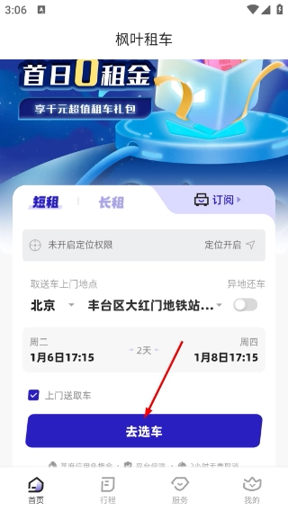 在【枫叶租车】页面选择【短租】或【长租】,设置好取车与送车的地点和时间后,点击【去选车】按钮,即可进入车型选择环节。