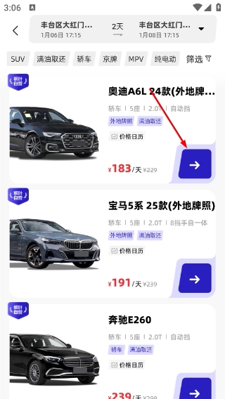 进入选车界面后,能够筛选【SUV】【轿车】等不同车型,挑选像【奥迪A6L-24款(外地牌照)】这类具体车型,然后点击对应的按钮继续下一步操作。