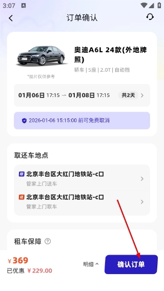进入【订单确认】页面,仔细核对【奥迪A6L-24款(外地牌照)】的取车与还车信息无误后,点击【确认订单】按钮以推进后续流程。