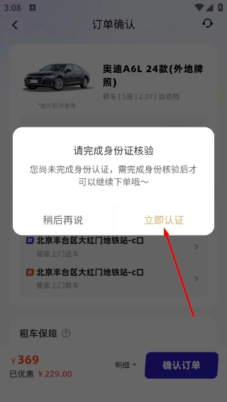 点击确认订单后会弹出【请完成身份验证】的提示,此时需要点击【立即认证】按钮完成核验流程,这样才能继续进行后续的租车订单操作。