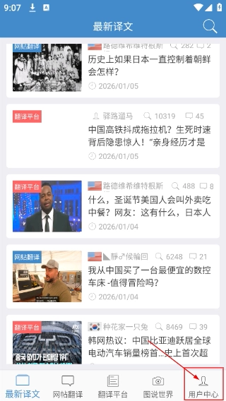 在【最新译文】页面,能够查看各类译文内容,点击底部的【用户中心】按钮,就能进入与个人功能相关的操作板块。