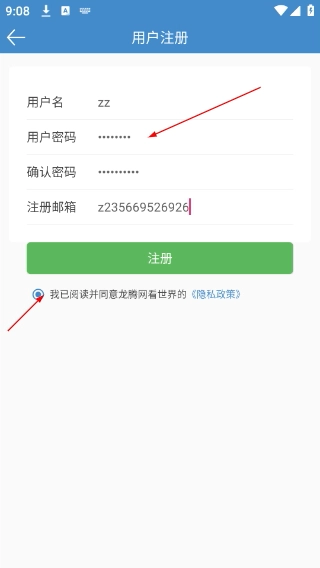 在【用户注册】页面,要填写【用户名】【用户密码(6到15位数字或字母)】等信息,并且得勾选相关协议。
