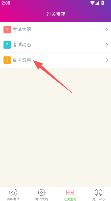 过关宝箱板块包含考试大纲与复习资料,提供备考指导,覆盖考试相关的各类辅助内容。