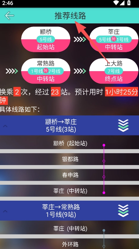 查询后呈现的推荐线路包含换乘信息、站点数量等内容,信息维度十分全面,能够帮助用户清晰规划出行路线。