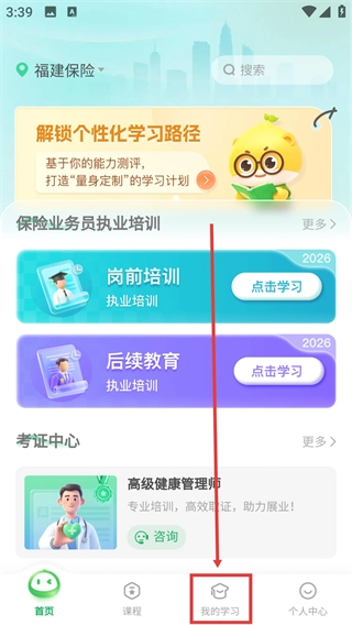 进入首页后,点击底部的【我的学习】按钮,就能进入学习管理页面。