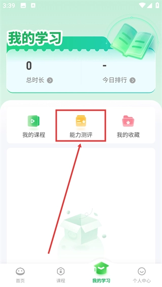 你可以在【我的学习】页面里,找到【能力测评】这个选项并点击它,这样就能进入测评页面,为定制专属的学习计划做准备。