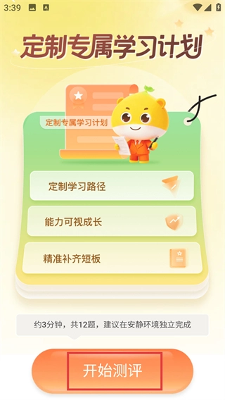 进入能力测评页面后,先查看【定制专属学习计划】的相关说明,再点击【开始测评】按钮来启动测评流程。