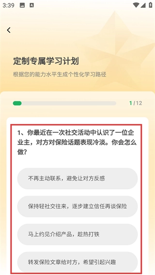 启动测评程序后,会进入题目界面,按照系统提示完成12道题的解答,系统便会自动生成适合你个人的专属学习规划路径。