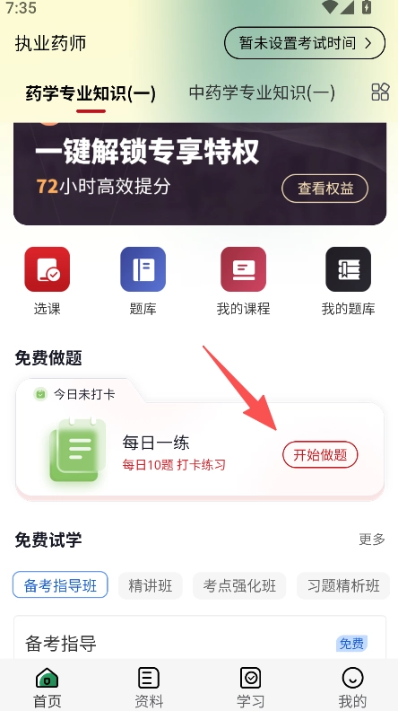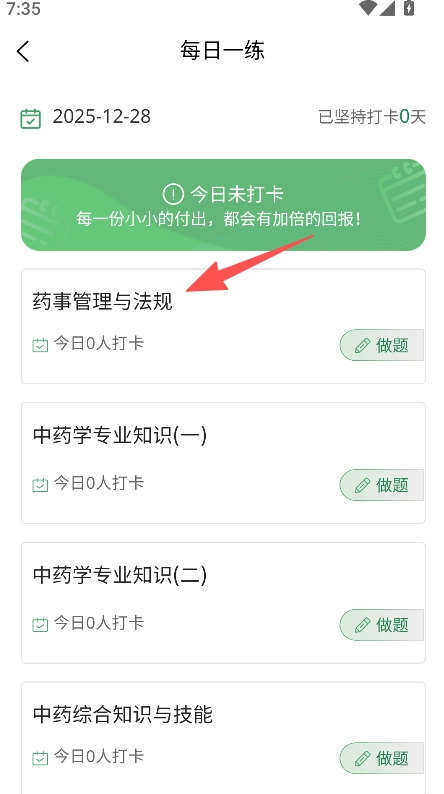 提供每日一练功能,进入对应板块选择科目,点击做题即可开展每日打卡练习。