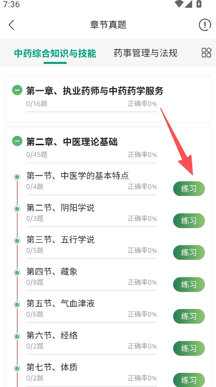 进入章节真题页面后,找到对应的章节并点击练习按钮,即可开始分章节进行题目练习。
