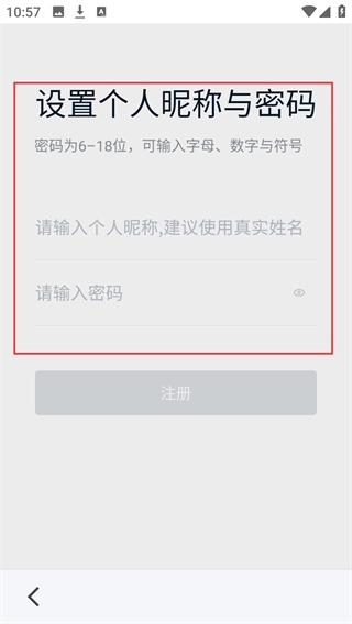 验证通过后,系统会跳转至“设置个人昵称与密码”页面。在此页面中,您需要输入个人昵称并设置密码,在确认所有信息无误后,点击【注册】按钮即可完成账号注册流程。