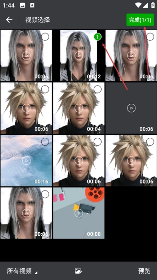 在视频选择页面,选定【目标视频】后,点击右上角的【完成】按钮即可。