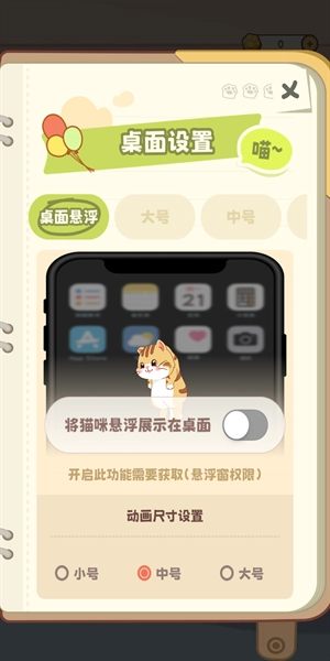 在桌面设置功能里找到桌面悬浮选项,可选择小号、中号或大号规格,然后点击开启即可。
