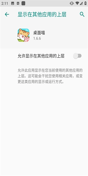 点击后会跳转至权限设置界面,在该界面中开启“允许显示在其他应用上层”的权限即可。