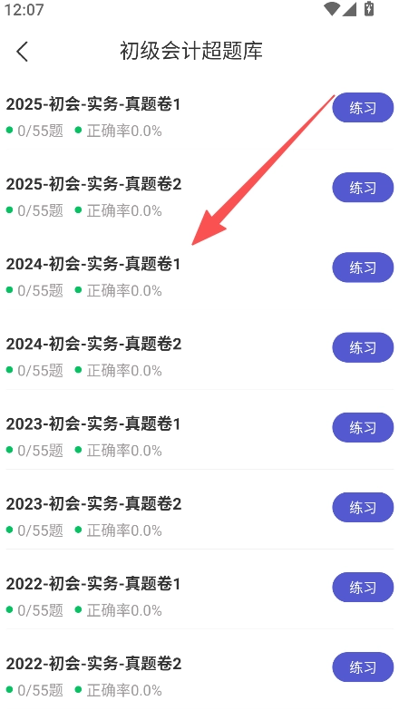 真题卷按年份有序排列,同步呈现题量与正确率数据,助力清晰把握自身练习进度与实际情况。