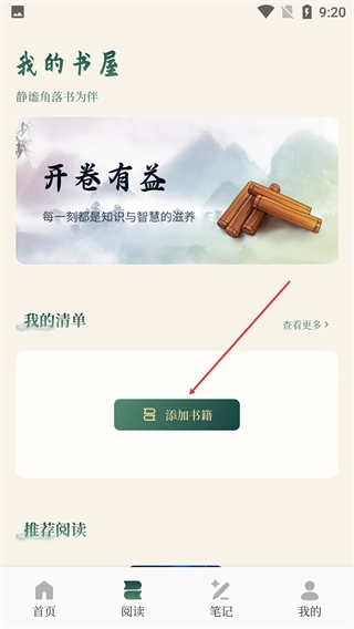 在【我的书屋】板块里,找到【我的清单】下面的【添加书籍】按钮,然后点击它。