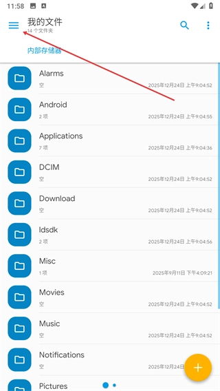 进入Solid Explorer的我的文件页面后,点击界面左上角的三条横线图标,以此展开侧边栏菜单。