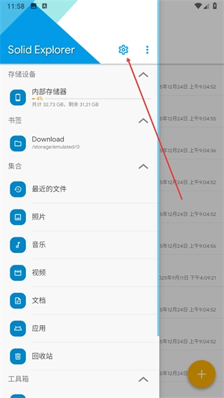 在侧边栏菜单中找到设置选项,点击该选项即可进入Solid Explorer的设置页面。