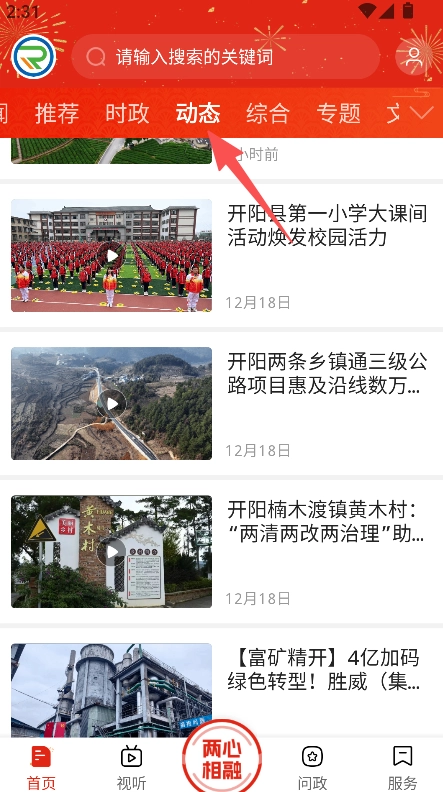 提供多类资讯分类功能,选择推荐、动态等分类,查看对应类别的开阳本地新闻列表。