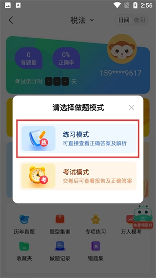 点击【章节练习模式】后,会弹出【请选择做题模式】的弹窗,选择其中的【练习模式】,就能直接查看正确答案和对应的解析。