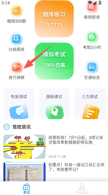 打开科目一提分神器,进入考试页面后,点击技巧讲解选项。
