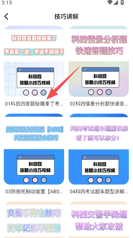 在技巧讲解页面选择对应的科目答题秘籍视频。