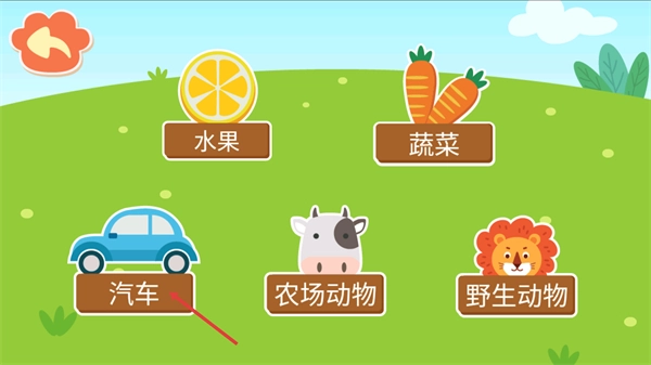 在分类学习界面,点击【汽车】这一分类选项,就能进入对应的物品认知学习页面,进而完成分类相关的认知任务。