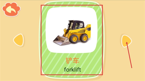 在认知页面,找到【铲车】相关的图文资料及对应的英文词汇【forklift】,点击页面右侧的箭头按钮,就能切换到下一个需要认知的物品。