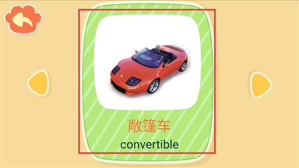在认知学习的流程中,通过查看【敞篷车】对应的图文资料以及它的英文表述【convertible】,完成对该物品的认知掌握,进而持续推进识字认知的相关环节。