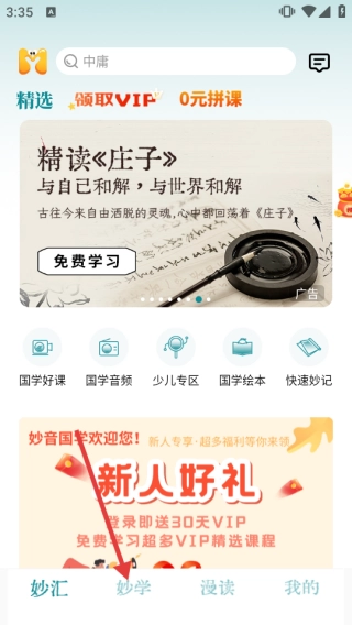 打开,点击底部【妙学】进入内容浏览页。
