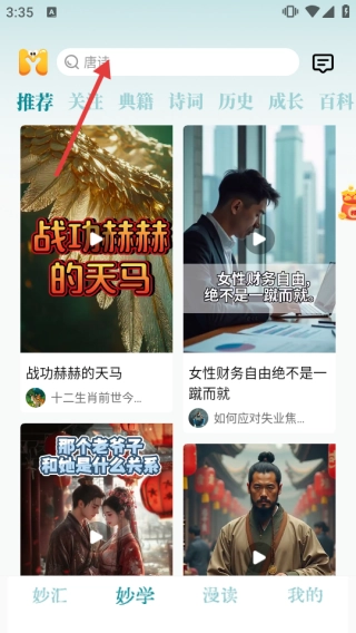 在妙学页搜索栏,输入关键词查找内容。