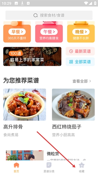 界面设有【搜索食材/食谱】的入口,点击底部的【收藏】按钮,就能进入与收藏相关的页面。