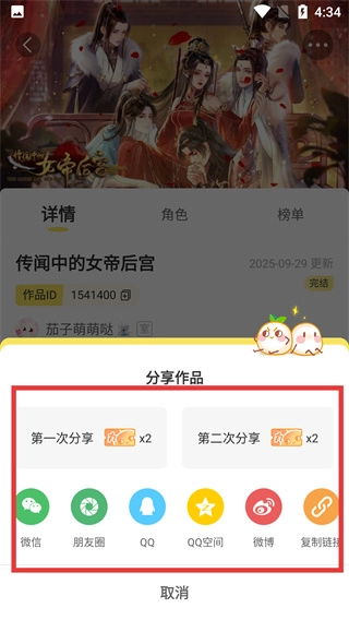 进入【分享作品】页面后,你可以选择微信、QQ等渠道来完成分享操作,并且在分享成功后还能获得相应的分享奖励。