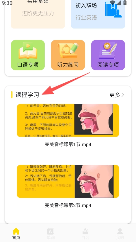 打开软件后,进入课程学习板块,浏览展示的音标课程内容。