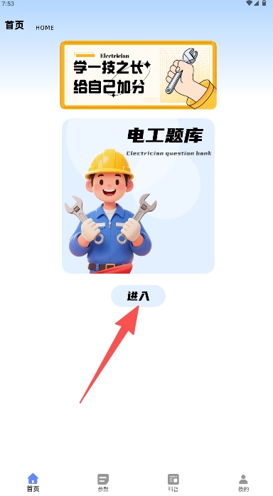 在首页找到“电工题库”板块,点击其下方的“进入”按钮即可开始使用该功能。