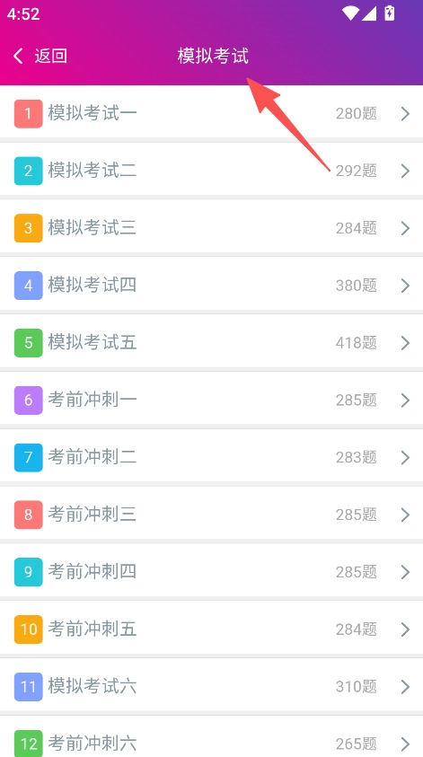 题库分类明确划分模拟考试与考前冲刺板块,依据不同类别展示相应的题目资源,方便用户根据自身需求挑选合适的练习内容。