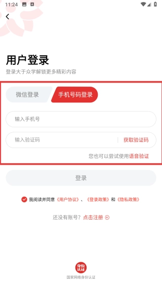 在登录页面选择【手机号码登录】选项,输入手机号码和验证码,勾选相关协议后完成登录操作。