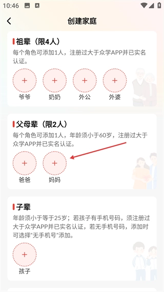 在创建家庭页面时,先选择辈分分类里对应的身份,再点击该身份旁的加号,即可进入信息填写页面。