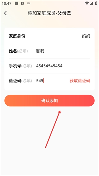 在完成家庭成员信息的填写操作后,点击页面上的“确认添加”按钮,就能完成该家庭成员的添加流程。