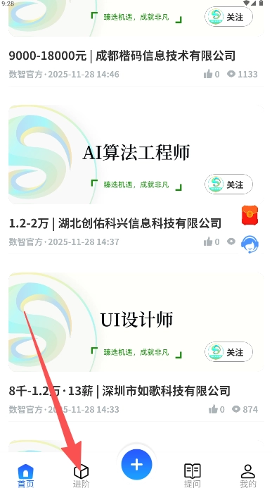 功能入口的设计清晰明确,首页和进阶这两个入口分别对应求职与学习这两大核心使用场景。