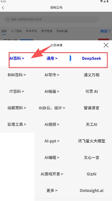 弹窗中的分类筛选功能,可通过“AI百科>通用>DeepSeek”路径,获取精准专业的内容。